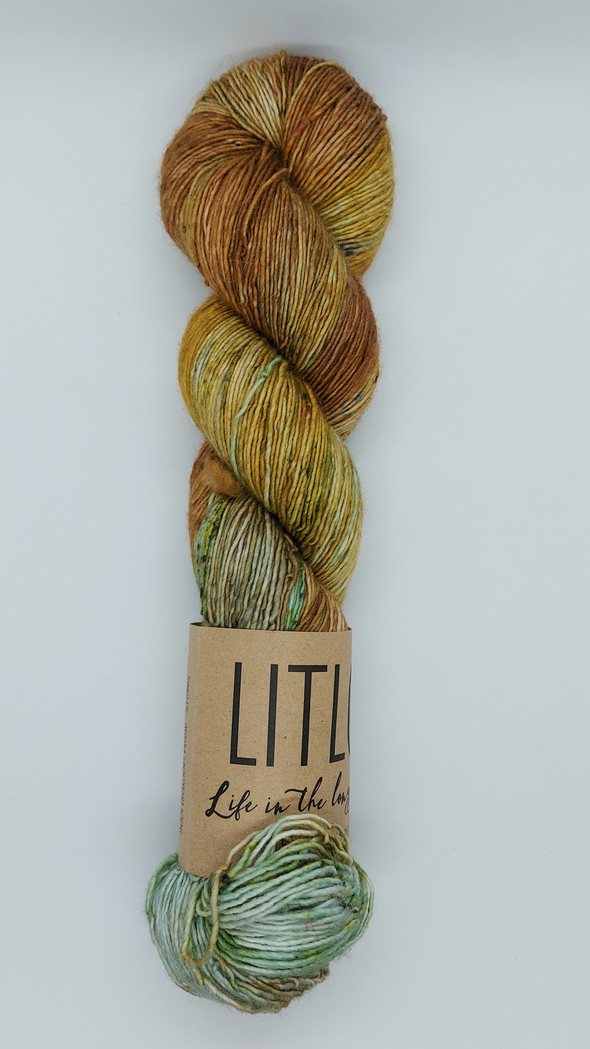Merino Singles fra LITLG er et fantastisk lækkert håndfarvet merinogarn fra Life In The Long Grass i Irland. Garnet er utrolig blødt og et forholdsvis fast spundet 1-trådet garn. Det er håndfarvet i små portioner, som netop er det, der gør garnet helt unikt og fyldt med liv. Farverne er meget delikate og inspireret af den irske natur. Der er desuden taget hensyn til miljø og bæredygtighed gennem hele processen, og alle labels er af genanvendt papir.