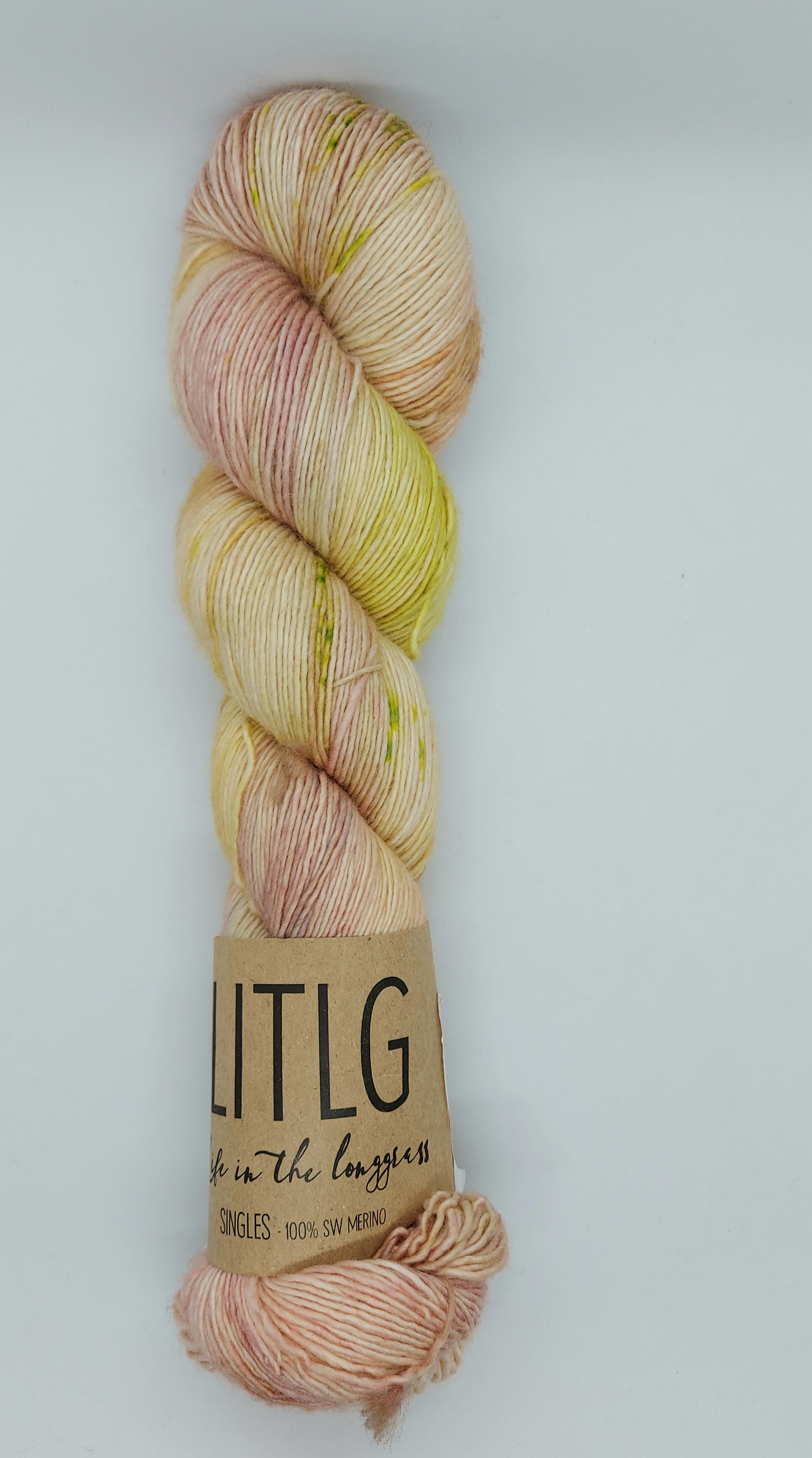 Merino Singles fra LITLG er et fantastisk lækkert håndfarvet merinogarn fra Life In The Long Grass i Irland. Garnet er utrolig blødt og et forholdsvis fast spundet 1-trådet garn. Det er håndfarvet i små portioner, som netop er det, der gør garnet helt unikt og fyldt med liv. Farverne er meget delikate og inspireret af den irske natur. Der er desuden taget hensyn til miljø og bæredygtighed gennem hele processen, og alle labels er af genanvendt papir.