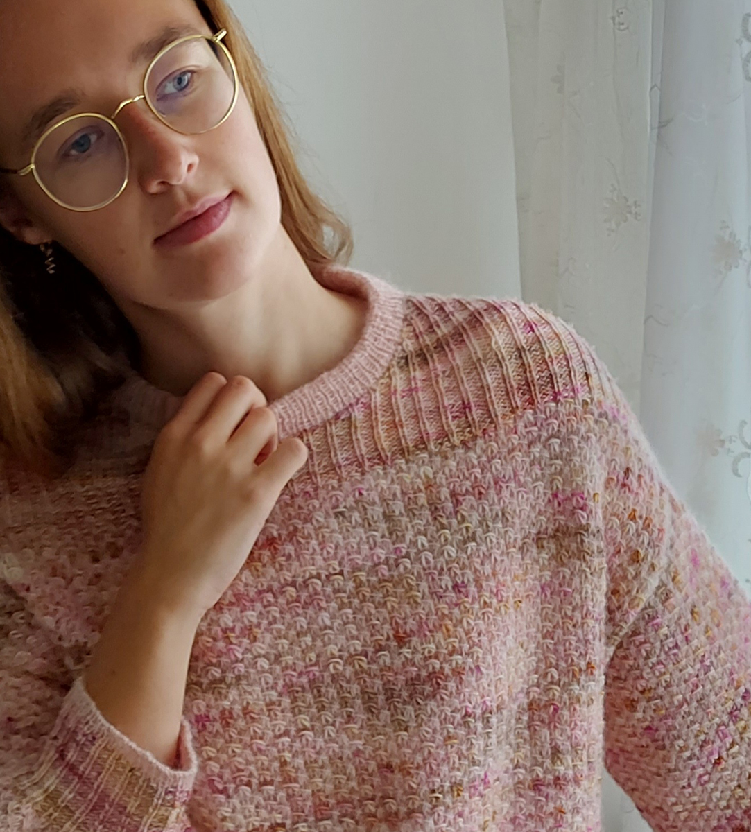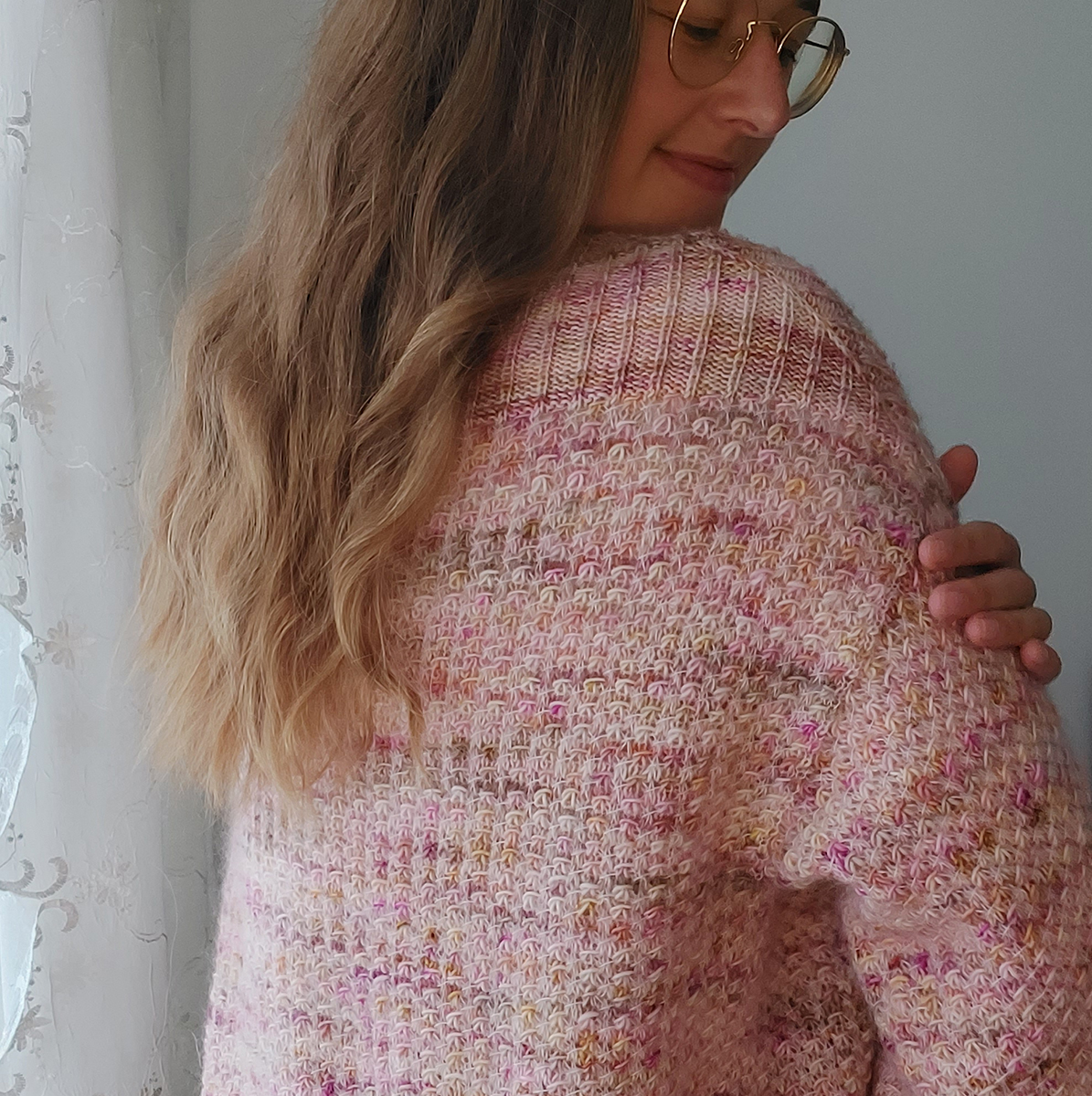 Der strikkes ombukket halskant med 2 tråde silkmohair. Bærestykket er ribstrikket med skrå skulderkonstruktion og drop shoulder effekt.