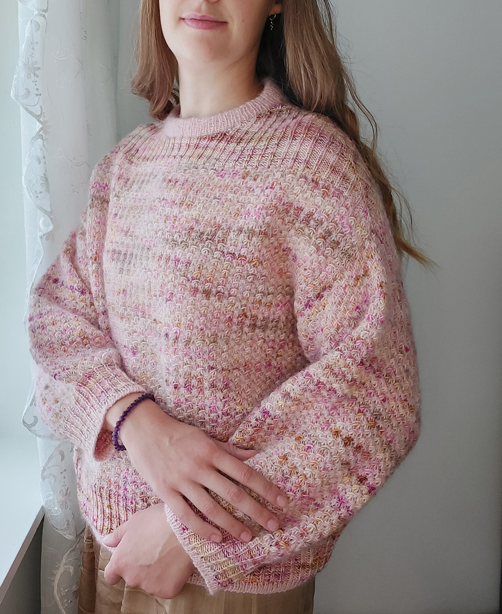 Selve kroppen strikkes i et stjernemønster, hvor man skifter mellemm to garnkvaliteter. Der samles masker op og strikkes ærmer oppefra og ned.
