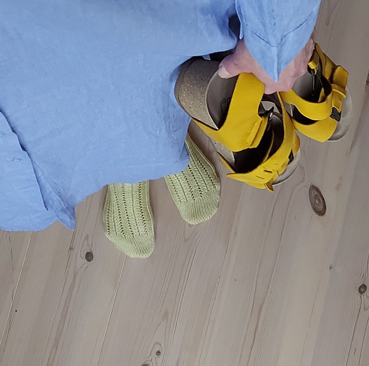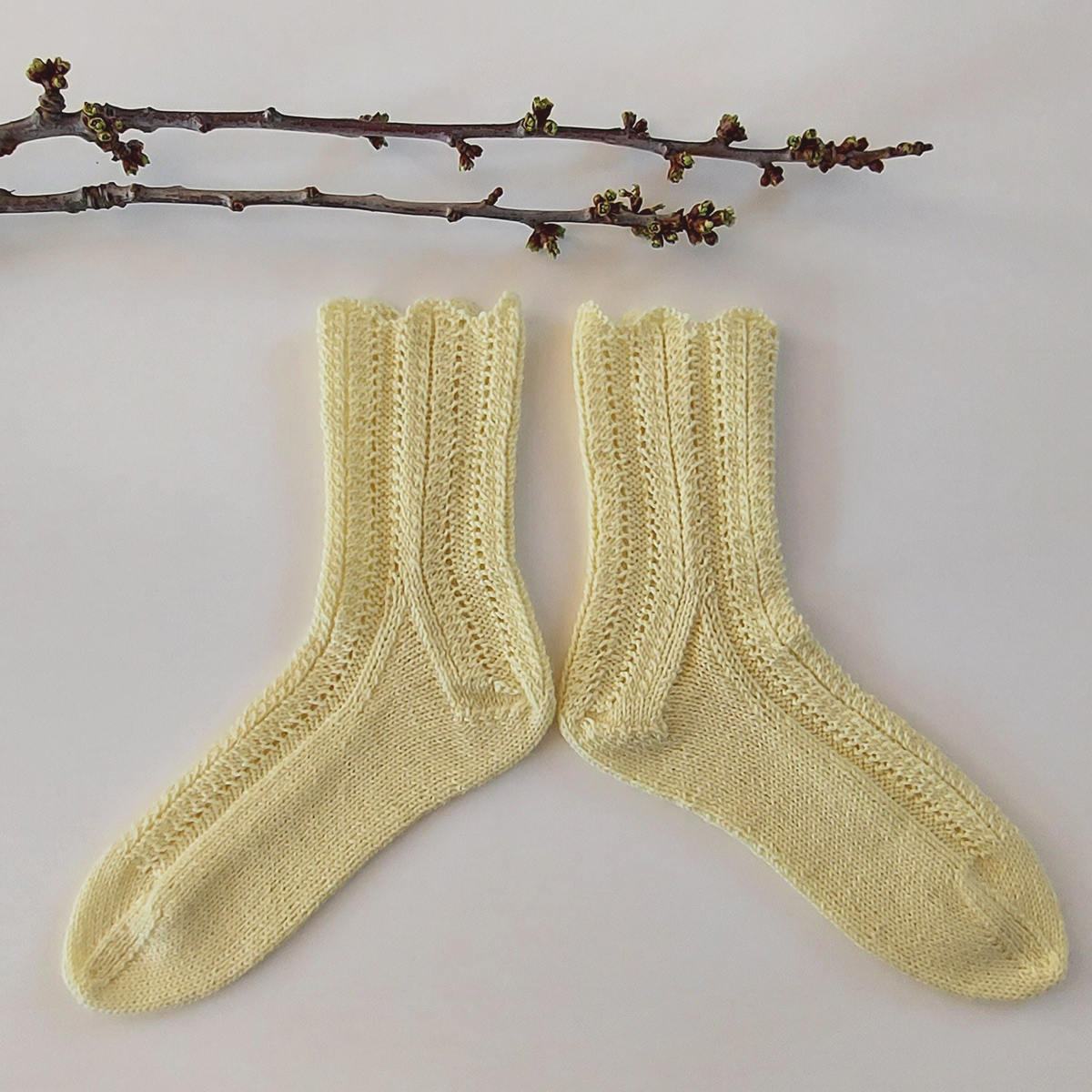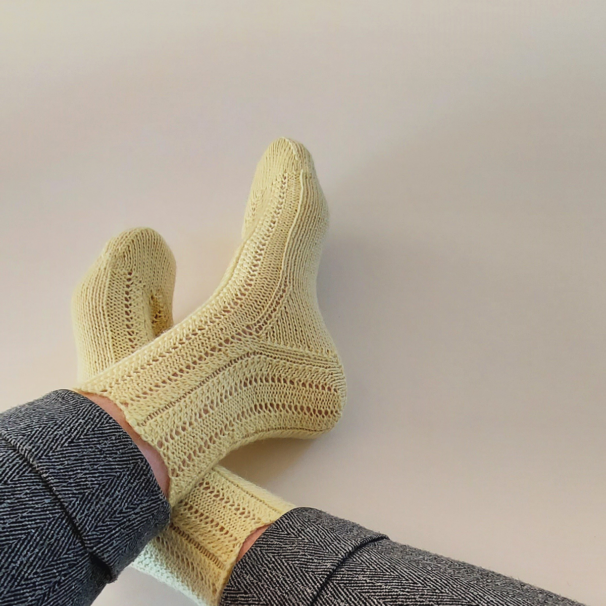 Spring Socks strikkes rundt på strømpepinde. Der startes øverst på skaftet, og strikkes ned mod tåen. Spring Socks strikkes med mønster over hele skaftet, ned over vristen og som en særlig detalje også ned langs hælen. Der strikkes kilehæl og glatstrikning på undersiden af sokken. Prøv sokken på, før der til sidst sluttes af med indtagninger til tå. Et par virkelig fine sokker, der evt. kan fremhæves i et par åbne sko.