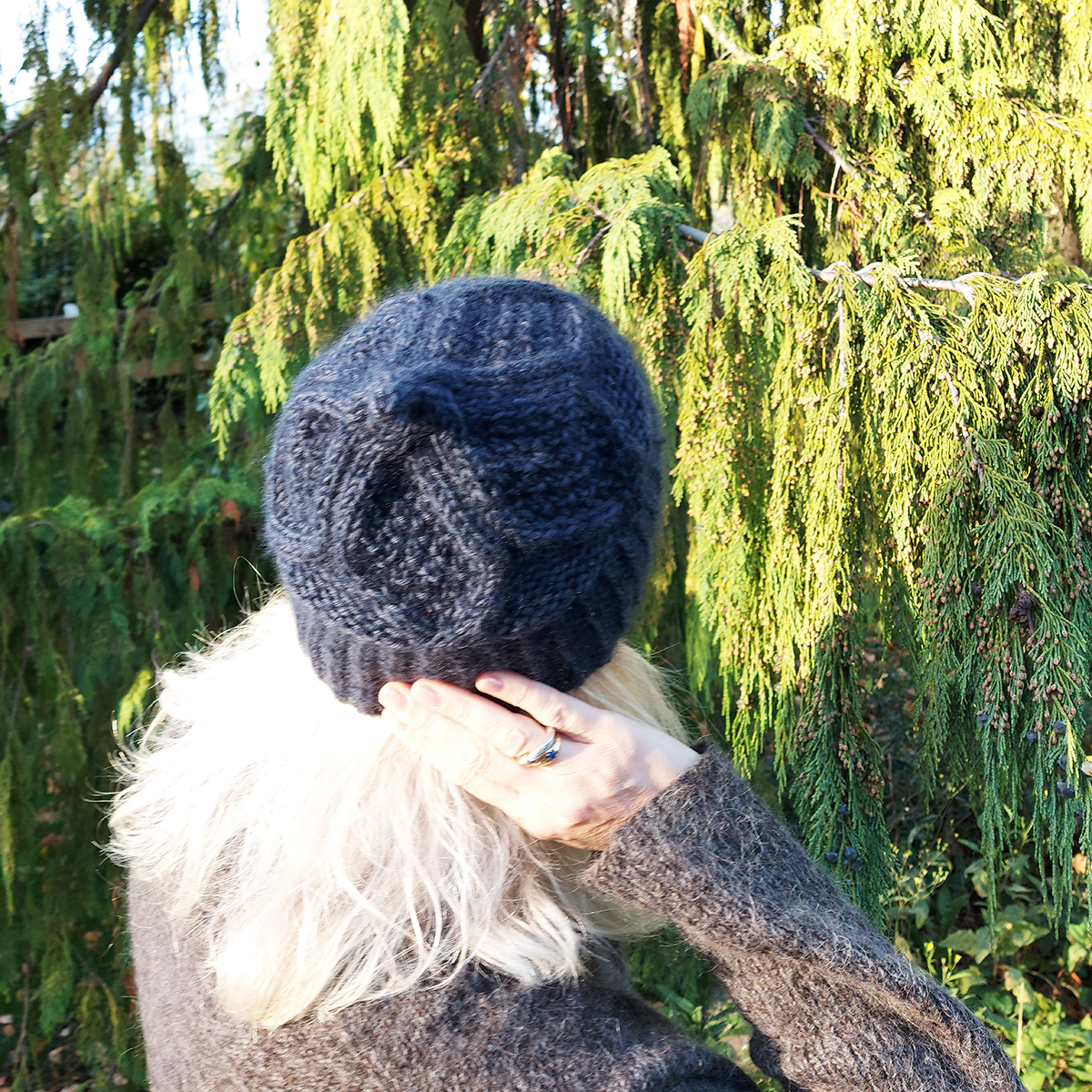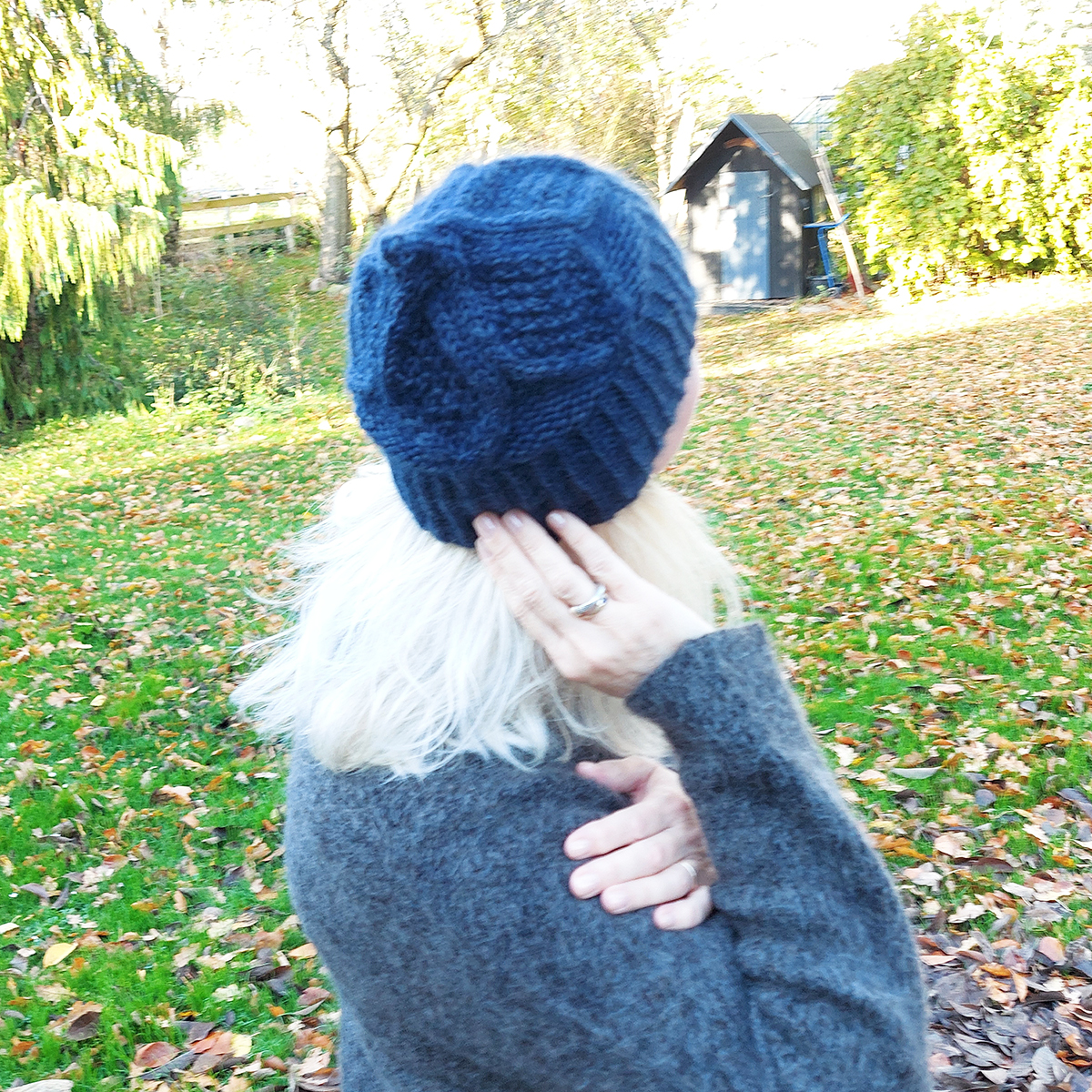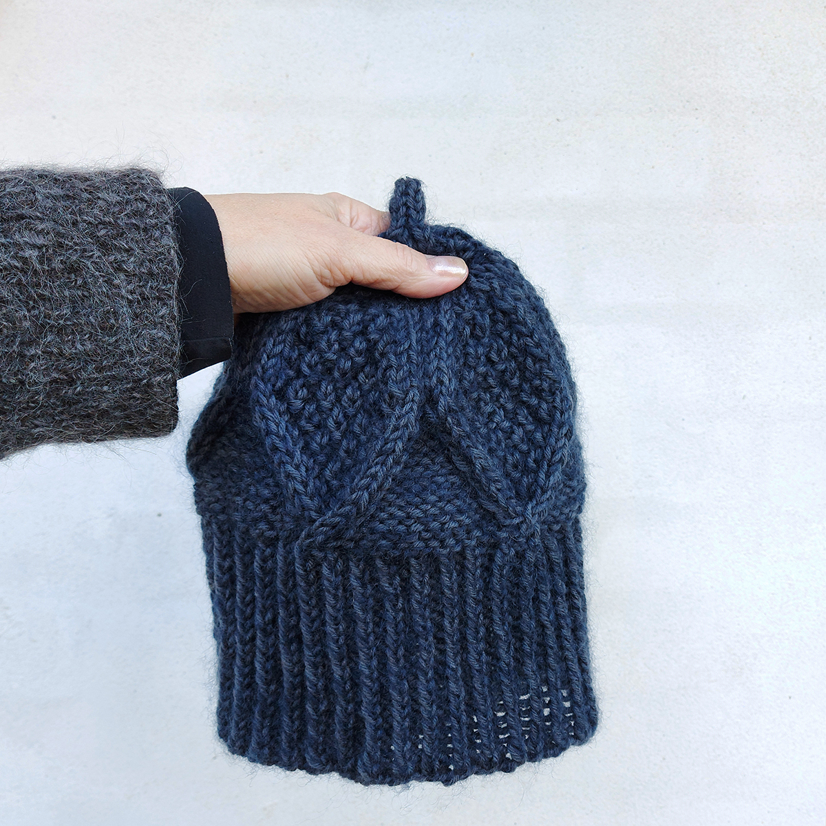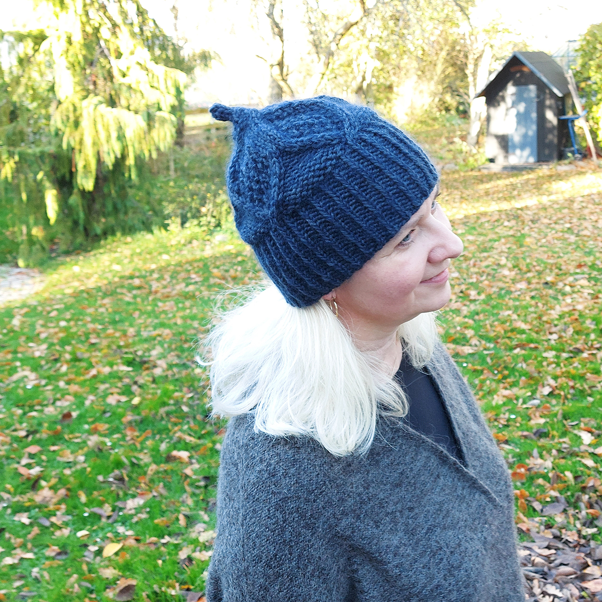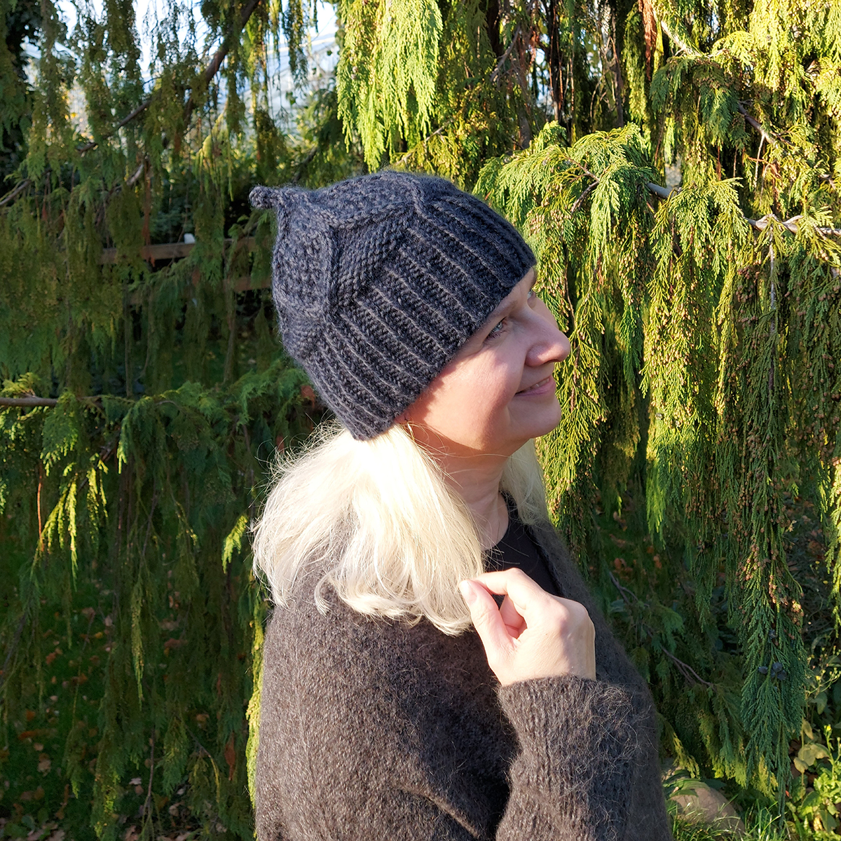 Toni Hue strikkes nedefra og op. Først strikkes en drejet ribkant, og herefter bladmønster med dobbelt perlestrik. Første del strikkes på rundpind (40 cm), mens toppen strikkes på strømpepinde eller på en længere rundpind med Magic Loop-teknik. Da huen er strikket på p. 7 mm er den ikke meget tæt, men mere let i ribben. Bredden på ribkanten gør, at huen sidder rigtig godt.