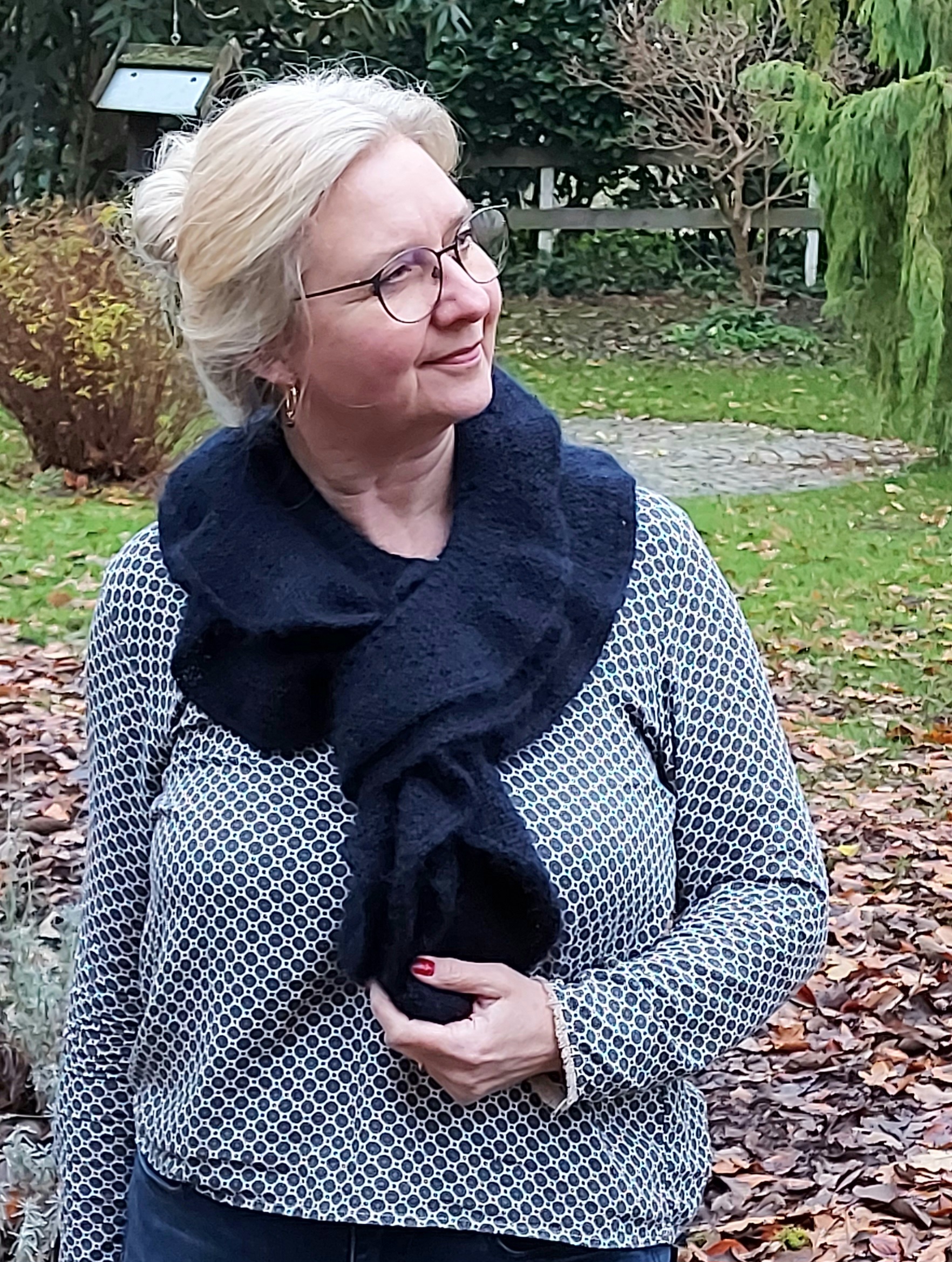 The length of the scarf allows you to wrap it several times around your neck, or you can fold it in half and pull the ends through the loop. The choice of yarn for the Swirl Scarf has a big impact on how it drapes and feels to wear. When knitted with 2 strands of silk mohair, the scarf becomes very luxurious, light and airy.