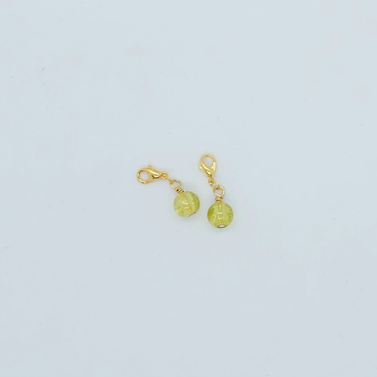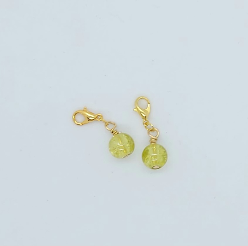 Fine gyldne maskemarkører med farvet glasperle. Markørerne er monteret med en gylden karabinhage, som kan åbnes. Markøren kan derfor sættes fast i en maske på strikketøjet, eller placeres på strikkepinden. Perlen har en passende tyngde, så man på en behagelig måde nemt kan mærke den på strikketøjet når man strikker.