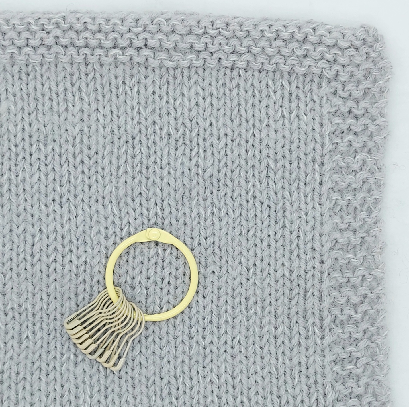 Her er de små markører samlet på en ring som kan åbnes. Så er der altid styr på markørerne i strikketasken.