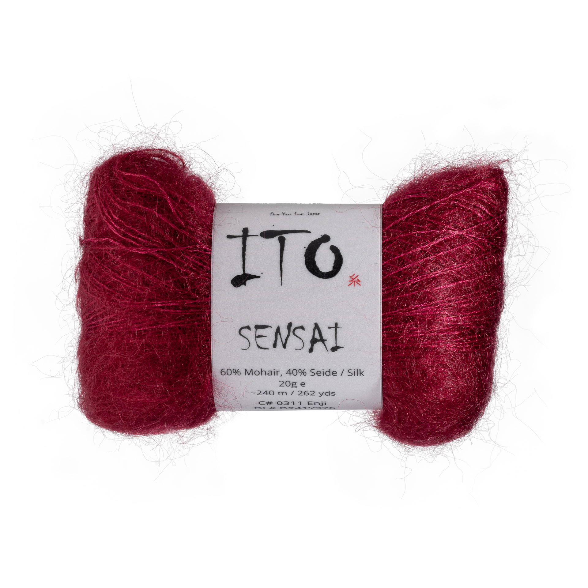 ITO Sensai er en smuk og helt blød blanding af silke og mohair med en utrolig lang løbelængde. Da indholdet af silke er højt, er garnet meget glansfuldt og elegant. Det betyder også, at ITO Sensai holder rigtig godt på mohairfibrene, og garnet ikke fælder så meget som andre Silk-Mohair kvaliteter kan gøre. Garnet er helt let og strikker man ITO Sensai alene, er det virkelig velegnet til lace-sjaler eller helt lette bluser, men er især fantastisk som følgetråd sammen med andre garner. Det kan også lægges dobbelt eller tredobbelt, hvis man ønsker det helt luftige og luksuriøse udtryk. Et af markedets virkelig bedste kvaliteter.