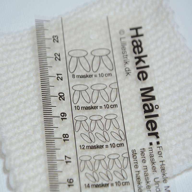 Her er et redskab til hækling som du måske lige står og mangler. Hækle Måleren giver dig mulighed for hurtigt at afgøre din hæklefasthed og undersøge om den passer til opskriftens krav. Hækle Måleren føres let hen over arbejdet og hæklefastheden kan nemt og hurtigt aflæses.