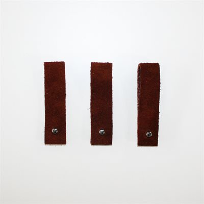 Læder-stropperne knappes på dit strik, og kan derfor let flyttes, og placeres f.eks. ved hals eller på ærmet. Da knapperne er lidt grove, passer læder-stropperne bedst til trøjer strikket på p. 4œ-5 og op.